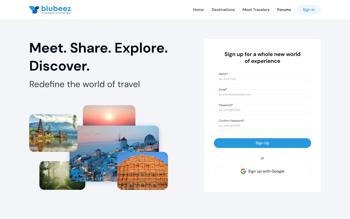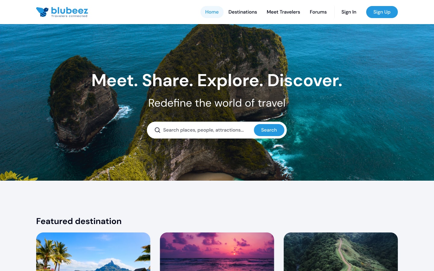 Blubeez was designed as a social travel platform that brings together destination discovery, community interaction, trip planning, and experience sharing in one product. I joined as the sole designer and took the platform from early concept to a launch-ready web application.